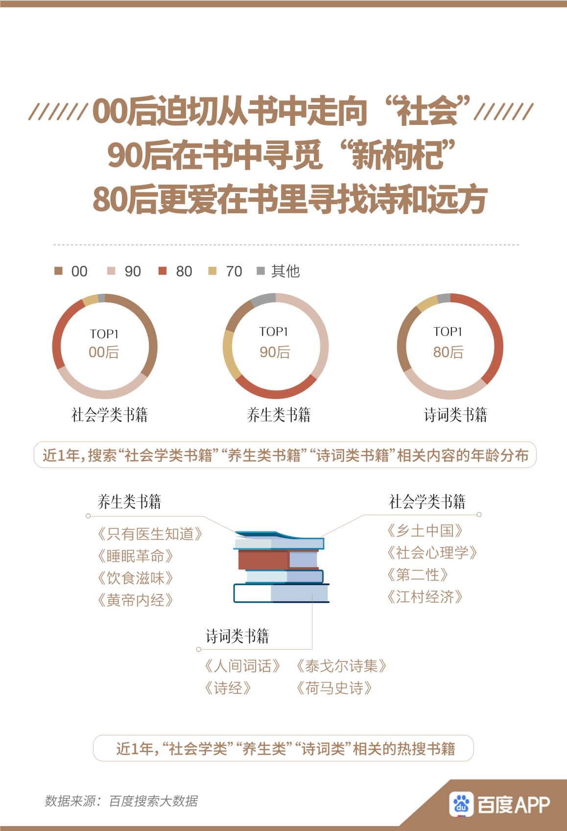 已经步入而立之年的90后,开始关注“精神养生”。边熬夜,边阅读《睡眠革命》、《只有医生知道》等养生类书籍是他们的生活常态。而该养生的中年人不仅是阅读小说的主力军,也是搜索“诗词书籍”最多的人群。