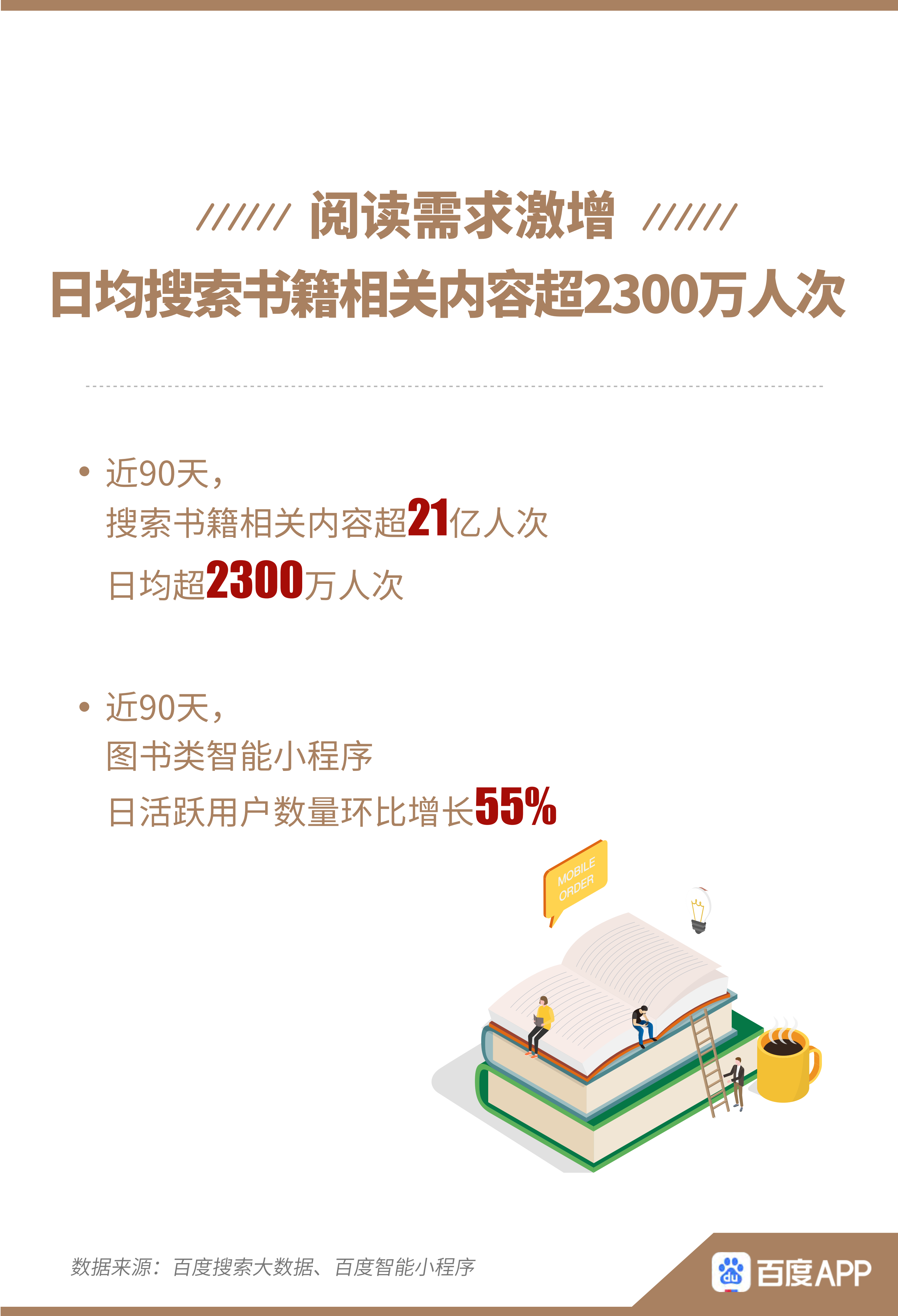 近日,百度APP联合人民日报数字传播《有数青年》工作室发布的《百度全民读书搜索大数据报告》(以下简称“报告”)显示,疫情宅家使网友阅读需求激增,近90天,日均超2300万人次在百度搜索书籍相关内容,累计超21亿人次,图书类智能小程序日活跃用户环比增长55%,读书、购书线上化再进一步。