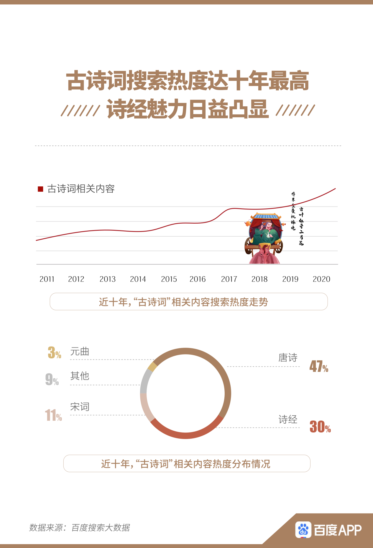 事实上,“四大名著”热度年胜一年的背后,是人们对传统文化的热爱日益提升。这也反映在古诗词的搜索热度之上。报告显示,古诗词搜索热度逐年攀升,在2020年达十年最高。诗经越来越多地出现在人们视野之中,搜索热度占比30%。
