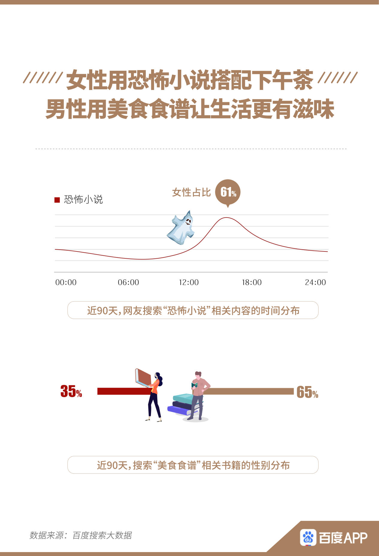与往常印象相反,搜索“恐怖小说”相关内容的人群中,女性比男性更多,占比61%,下午15时是搜索的高峰时间。而男性更关注“美食食谱”相关书籍,在搜索相关书籍的人群中占比65%。