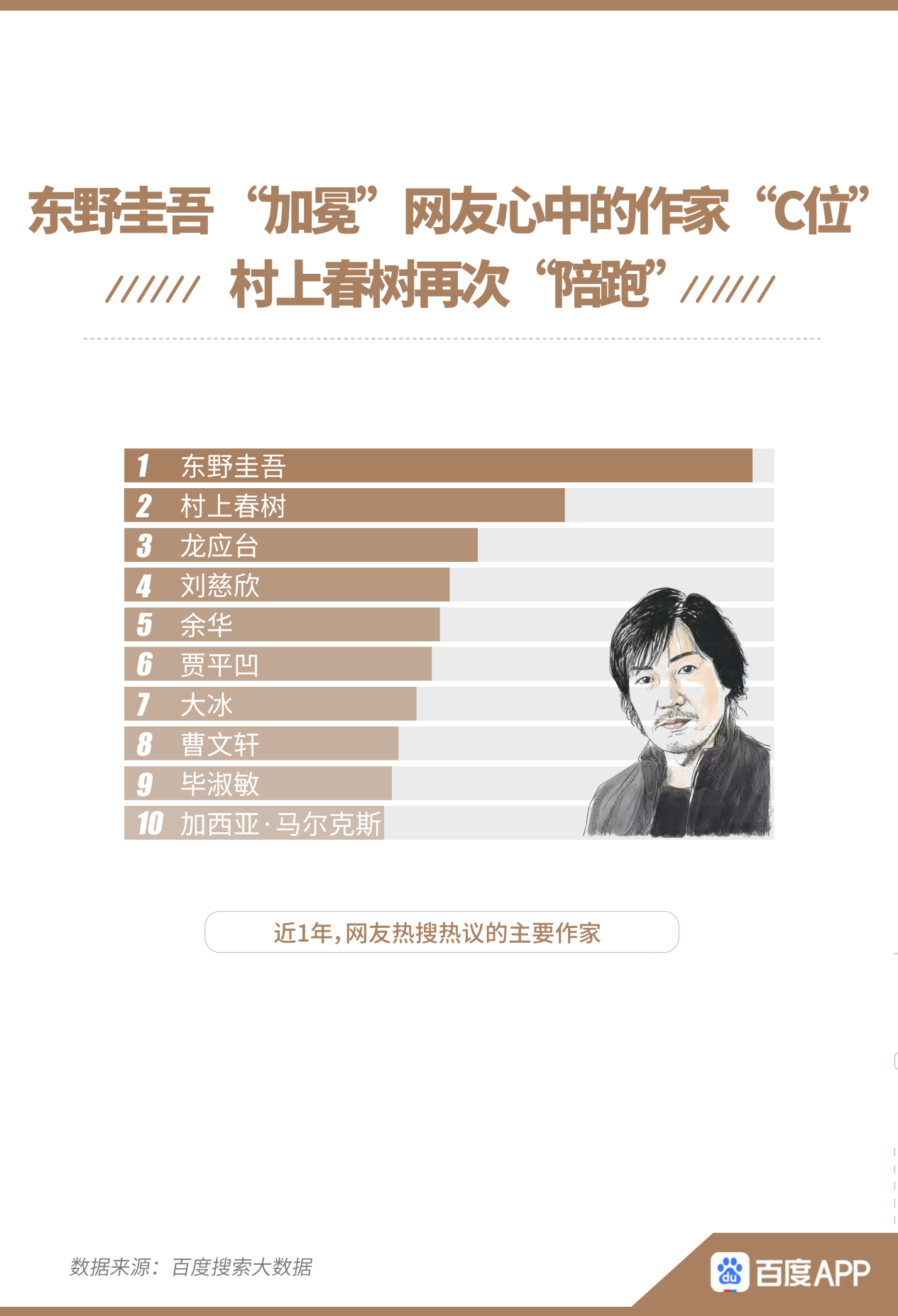 经典深入人心,也无碍阅读世界百家争鸣。报告盘点了近1年网友热搜热议的主要作家,推理小说家东野圭吾占热度C位,村上春树位居第二,再“陪跑”。