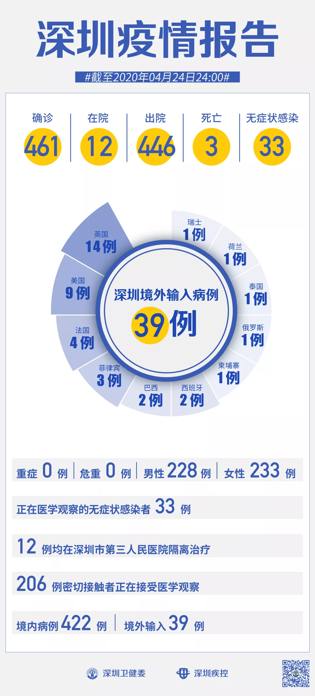 截至4月24日24时,深圳累计报告新冠肺炎病例461例。4月24日当天新增出院1例。