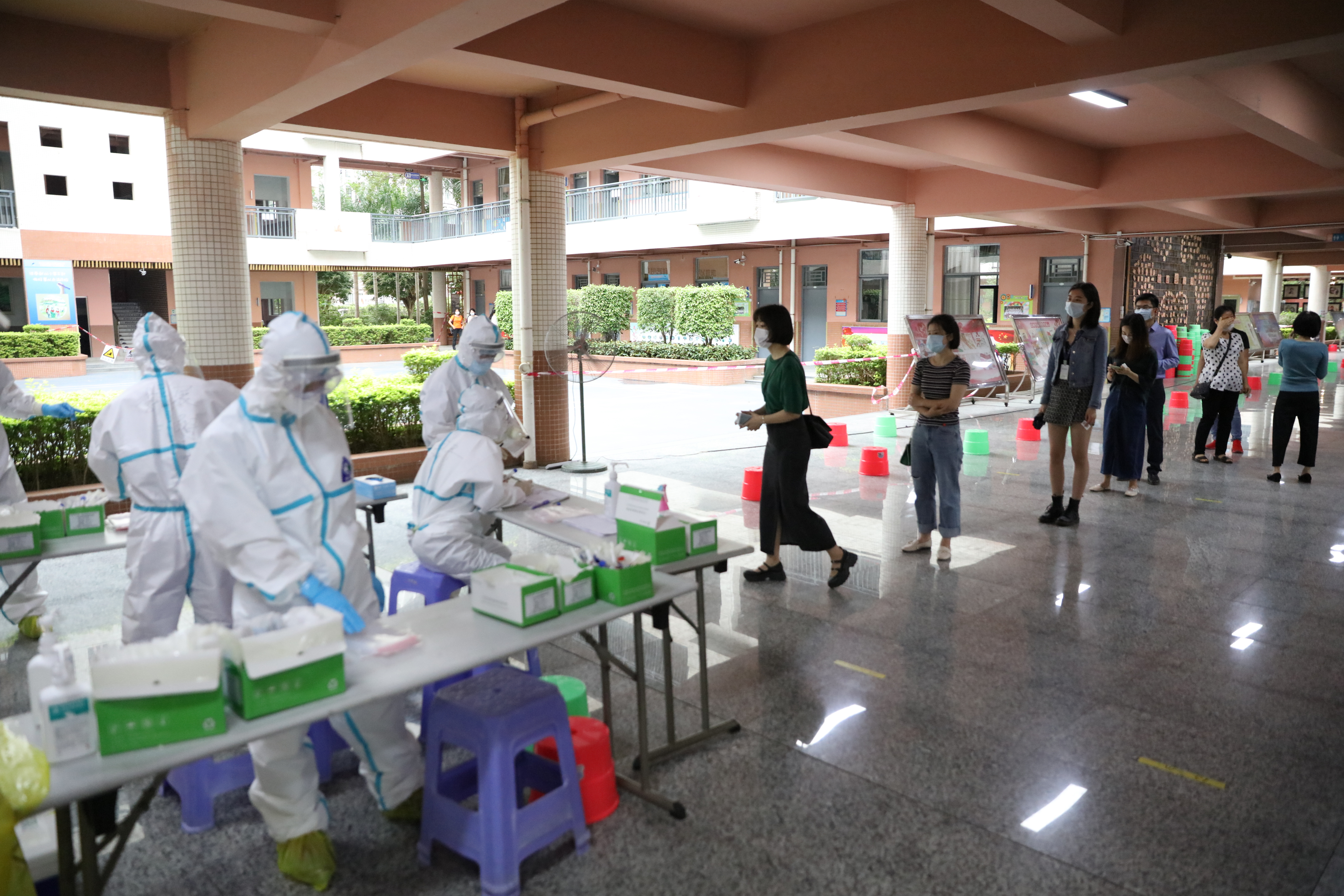 见圳客户端·深圳新闻网讯(记者 王志明 通讯员 王霏 孙佳隆)4月21日,在育才四小的临时检测点,前来接受核酸检测的教师已排起了长队,四名前海蛇口自贸区医院的医护人员身着防护服,正在有序为教师们进行检测。