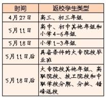 在确保师生安全的前提下,根据学校疫情防控和检查验收情况,我市各级各类学校学生分批次返校安排已经明确(见右表)。