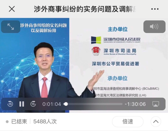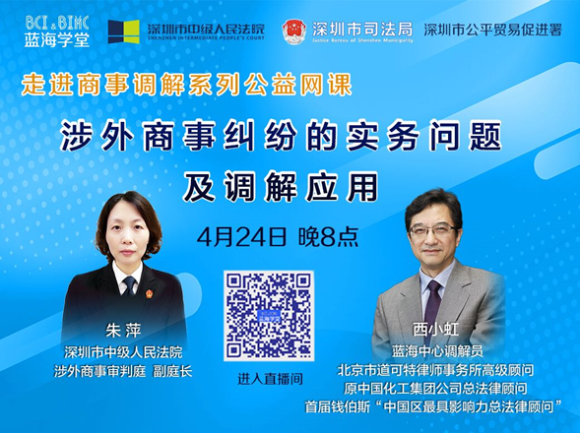 本期“云课堂”有幸邀请到深圳市中级人民法院(以下简称“深圳中院”)涉外商事审判庭副庭长朱萍和深圳市蓝海法律查明和商事调解蓝海中心(以下简称“蓝海中心”)调解员、北京市道可特律师事务所高级顾问西小虹律师作为授课嘉宾。