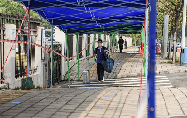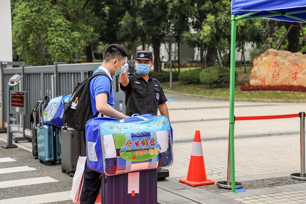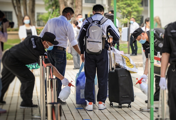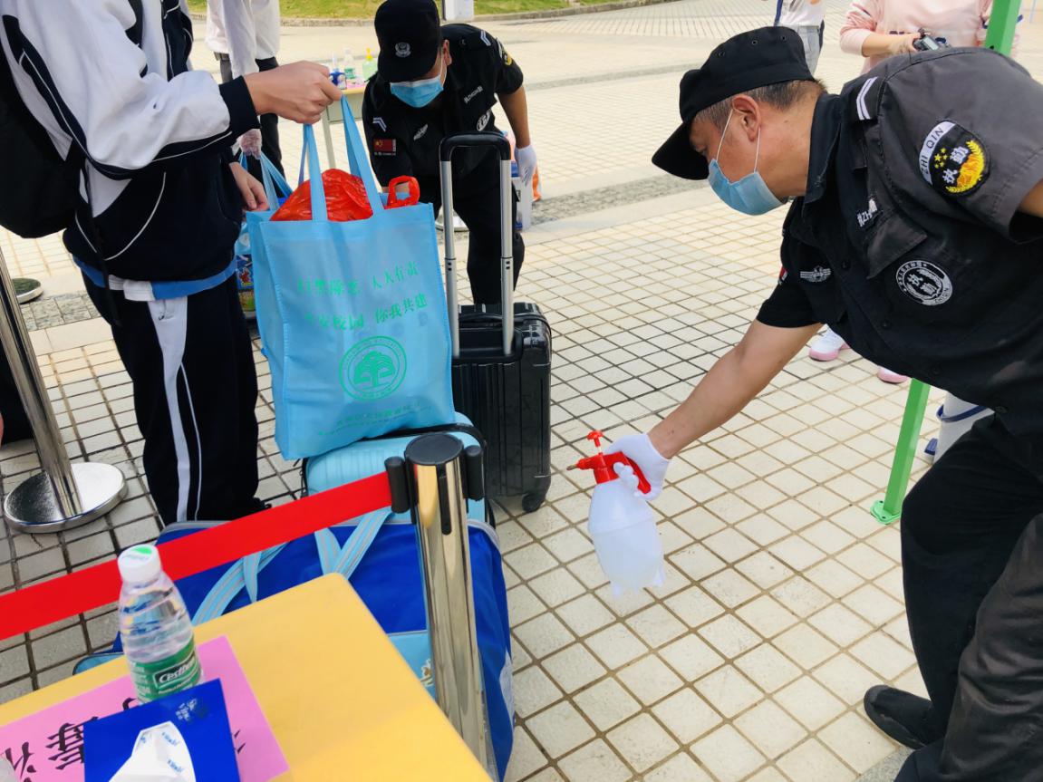 体温测量、手部消毒和行李消毒后,同学们进入校园