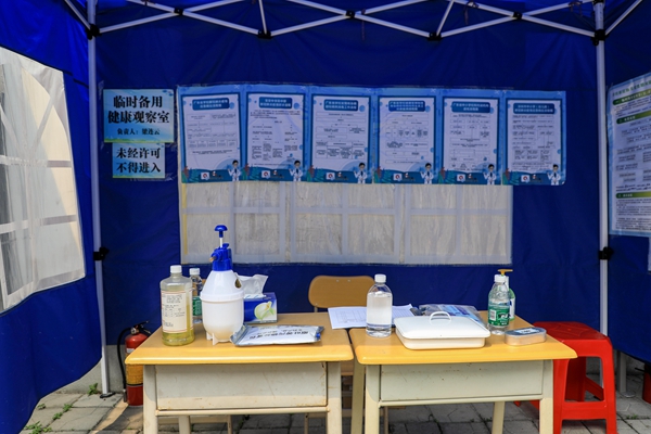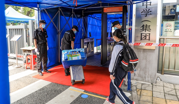 记者在现场看到,学校在校门外就开始设立进入通道,使学生分批分流进入校园,在校门口设立两条检测通道,主要是为了避免人员在校门口聚集,学生无论从哪条通道进入都要经过三个步骤:体温测量、手部消毒和行李消毒。同时学校门口配有健康观察室以及医护人员,体温超过37℃就需要进行观察,并及时对校园环境进行消杀。
