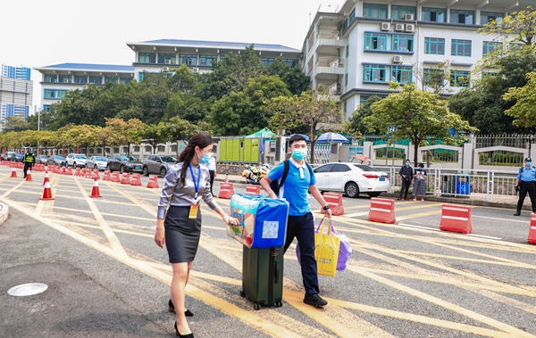 宝安中学位列其中。下午两点开始,宝安中学高中部就开始有学生陆续返校,该校对学生返校采取分时分段分区的措施,认真严谨做各项相关校工作。不同于初三部,由于住校要求,高三学生都拿着行李进入校园。