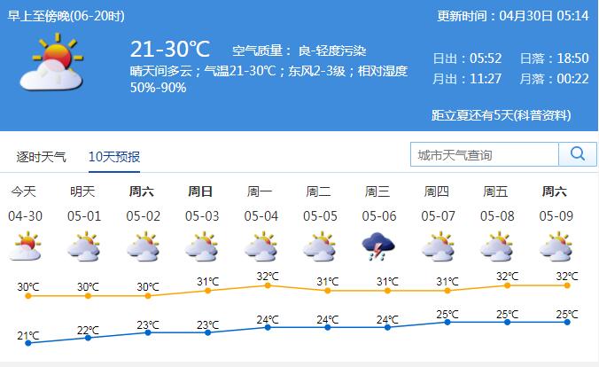 见圳客户端·深圳新闻网2020年4月30日讯 我市今天晴天间多云,气温21-30℃;东风2-3级,相对湿度50%-90%。五一假期期间(5月1-5日)天气总体平稳,以多云为主,早晚有轻雾,其中5日前后偶有短时阵雨;假期期间最高气温可达31-32℃,中午前后天气炎热。森林火险气象等级较高,要注意用火安全;注意防暑防嗮。