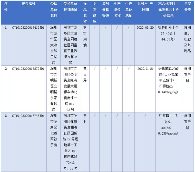 见圳客户端·深圳新闻网2020年5月1日讯(深圳特区报记者 杨德琦)4月30日,深圳市市场监督管理局发布第十四期食品安全抽样检验情况通报,3月共抽检餐饮环节食品1009批次,涉及餐饮环节经营主体919家次,共检测食品指标6347项次。其中不合格样品8批次,涉及不合格食品类别有食用农产品6批次,黄豆芽、萝卜、鸡蛋、油麦菜、牛蛙等在列;餐饮食品1批次,为即食白米饭;食用油、油脂及其制品1批次,为煎炸用油。涉及不合格项目类别为兽药残留、农药残留、非食用物质、微生物污染、品质指标。