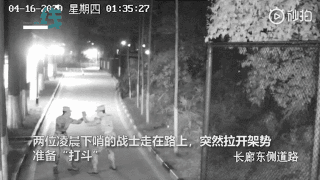 两位凌晨下哨的战士走在路上,突然间拉开架势,准备“打斗”。剑拔弩张之际,突然画风一转,两人做起了互相加油打气的动作。