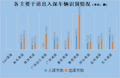 广深高速新桥收费站,龙大高速罗田收费站,梅观高速观澜路段、机荷高速清平至排榜立交、惠盐高速荷坳路段,均出深方向车行缓慢。其中,出深车辆最多为梅观高速,达到15万辆。