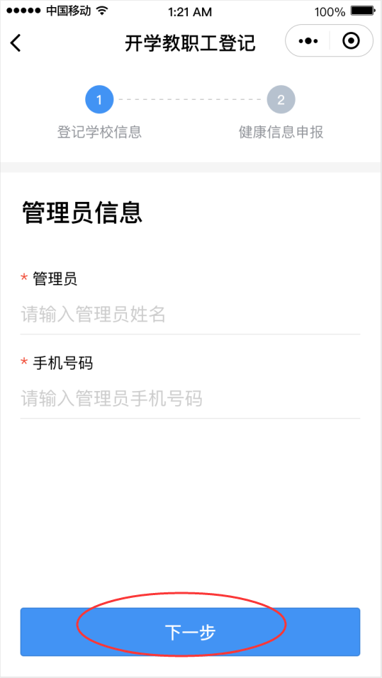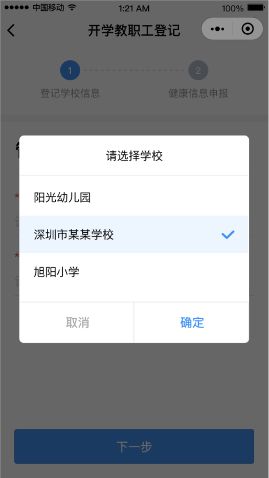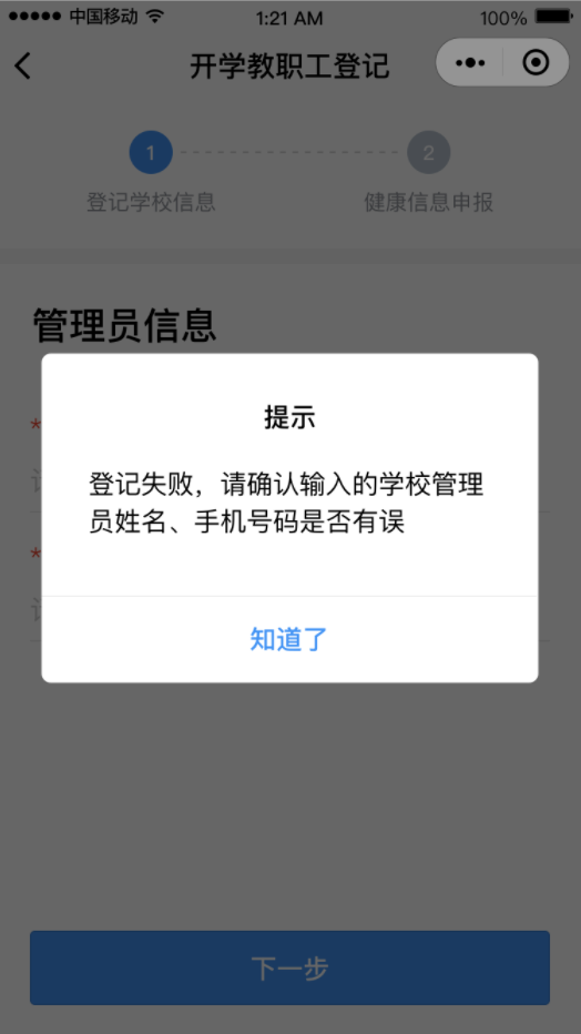 ②点击“马上登记”按钮,填写学校管理员姓名和手机号码(学校管理员姓名和手机号码请询问学校获得)后点击“下一步”,然后选择对应的学校。