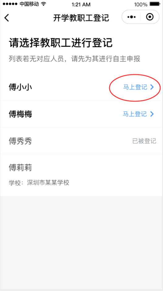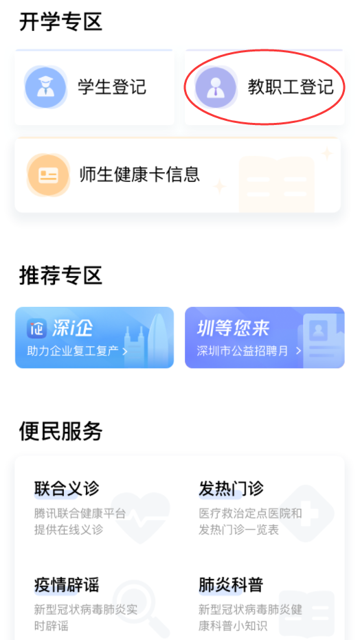①在首页开学专区,点击“教职工登记”进入申报人员列表,进行自主申报和实名认证。