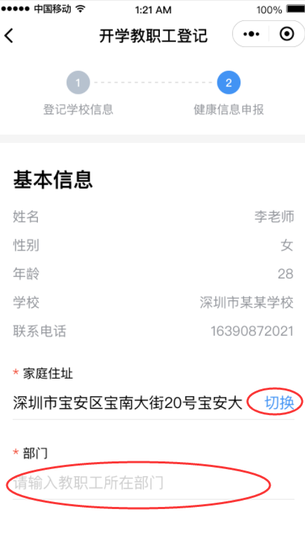 ②进入“学生登记”页面,点击“马上登记”按钮,填写班主任姓名和手机号码后点击“下一步”,然后选择对应的班级,进入健康申报卡界面。