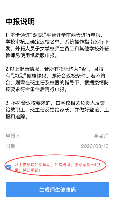 ③完成健康信息申报,包括选择家庭住址、填写所在部门、申报健康情况等,请勾选申报承诺,点击“生成师生健康码”即可完成健康申报。