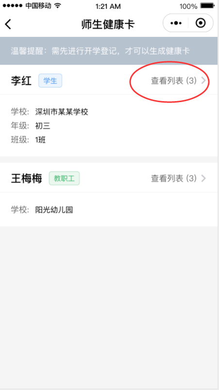在开学专区点击“师生健康卡信息”,然后点击“查看列表”,可查看您的健康申报记录,点击“重新生成健康卡”进行更新。