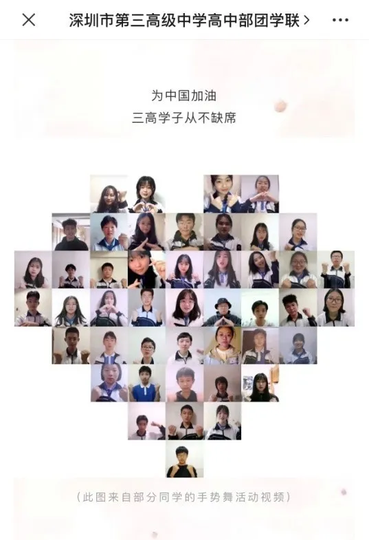 深圳市第三高级中学团委的庞聪老师和同学们一起录制了手势舞《不放弃》,为抗疫一线呐喊加油!活动先由庞聪老师和团委学生联合会的同学们策划、学习、录制、剪辑、审核,共同制作第一支手势舞视频。2月22日,他们在网上发起手势舞接力,收到上百名师生发来的接力视频,经过校团委汇总、剪辑、发布,引起强烈的社会反响。庞老师说:“疫情无情,人间有爱,正是疫情让我们紧紧地依靠在一起,手势舞应援虽不隆重盛大,但却也凝结了我们师生对于疫情重地武汉的鼓励与支持,对一线医疗工作者的无私奉献的感谢。”