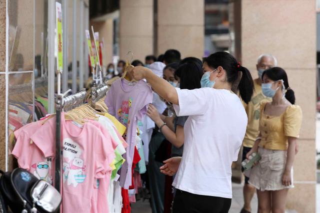 ▲夏季服装开售,不少商家打折促销,吸引市民选购。