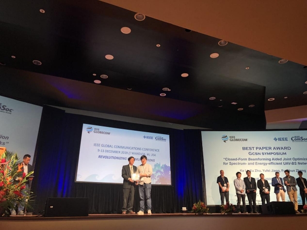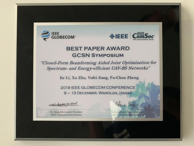 日前,由哈工大(深圳)电子与信息工程学院2017级硕士研究生李可担任第一作者,朱旭教授、蒋宇飞助理教授、郑福春教授为共同作者,哈工大(深圳)为第一通讯单位完成的论文《三维波束成形辅助的高谱效和能效的无人机基站网络的联合优化》(“Closed-Form Beamforming Aided Joint Optimization for Spectrum- and Energy-Efficient UAV-BS Networks”)入选通信领域顶级会议Globecom2019 (IEEE Global Communications Conference2019),并获得最佳论文奖。