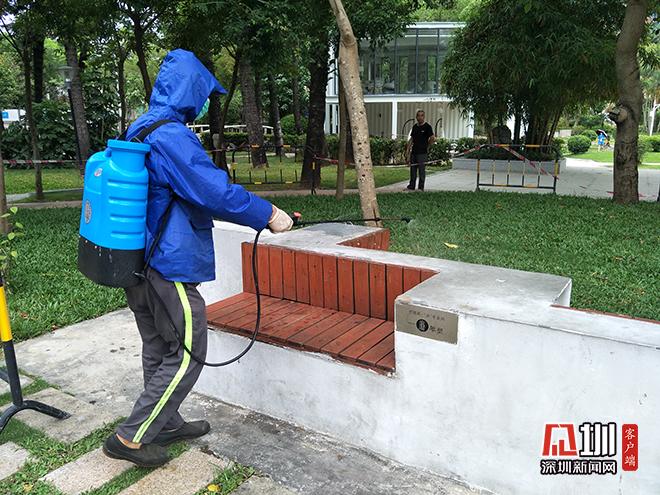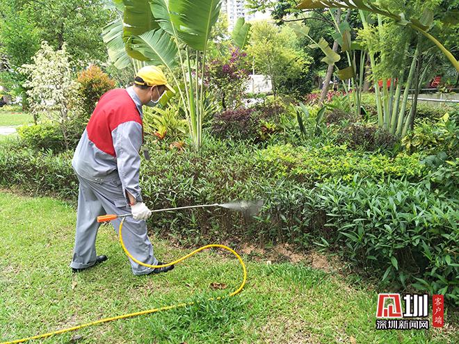 在深圳宪法公园内,消杀人员对园内花坛、草丛、垃圾箱底部等区域仔细喷洒药物,以灭杀和防治蚊蝇、蟑螂等病媒生物。保洁人员分工进行路面垃圾清扫、水中污物打捞、公共设施擦拭等工作,保持公园环境清洁卫生。在环境优美的海山公园,为彻底消杀“四害”,工作人员向路边茂密的花草丛内喷洒烟雾,及时更换毒鼠屋内的鼠药,确保不留下任何一处“死角”。