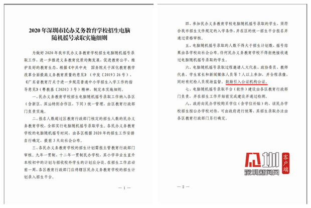 5月8日,深圳市教育局印发《2020年深圳市民办义务教育学校招生电脑随机摇号录取实施细则》(以下简称《细则》),《细则》中要求报名人数超过区教育行政部门核定的招生人数的民办义务教育学校,全部实行电脑随机摇号录取学生。参加民办义务教育学校电脑随机摇号录取的学生,须符合深圳市招生文件规定的入学条件。