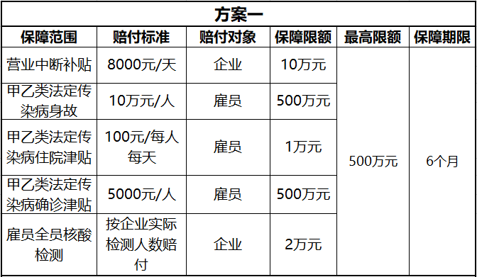 保险内容:营业场所因疫情原因导致停工/停产,公司员工复工后,因公感染甲乙类法定传染病(含新冠肺炎)身故,或因公感染甲乙类法定传染病住院,或确诊甲乙类法定传染病的,定额赔付;营业场所有员工被确诊(不含疑似),公司其他有接触的员工进行全员检测,据实赔付。