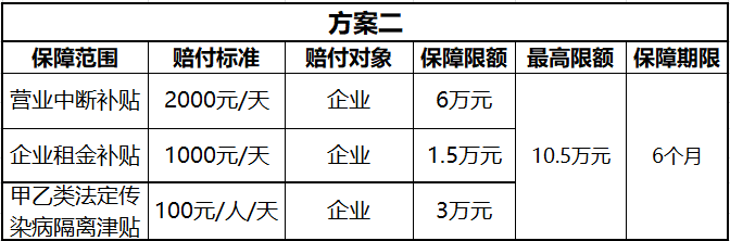 保险内容:营业场所因疫情原因导致停工/停产,根据企业遭受的实际损失情况、实际租金,导致员工被隔离发生工资、隔离费用等损失,据实限额赔付。
