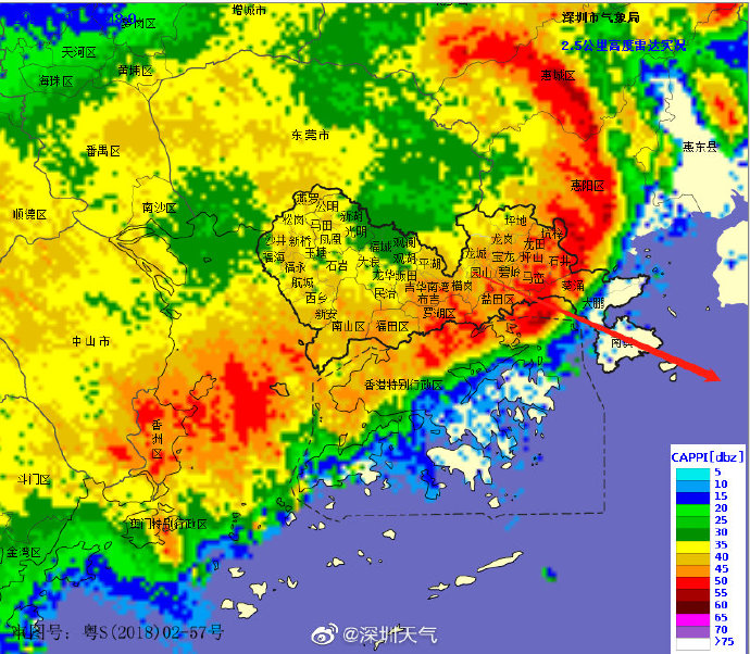 21时49分:目前强雷雨云团已给宝安、光明、龙华、南山、福田等区域带来强雷雨和大风,预计即将影响罗湖、盐田、龙岗、坪山和大鹏,将带来小时雨量30毫米左右的降雨以及8-9级的短时大风,请注意防御。