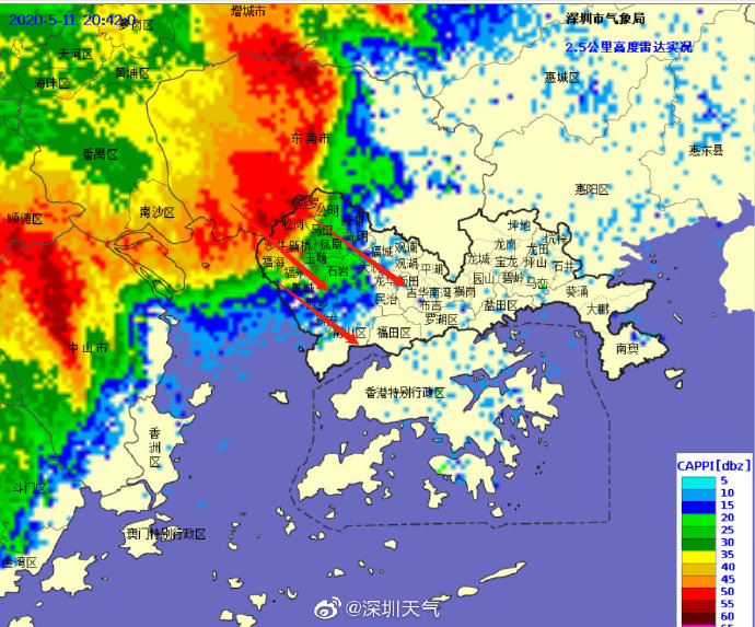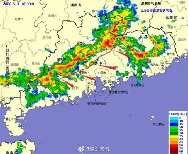 20时56分:目前强雷雨云团已开始影响宝安北部,未来一小时强雷雨自西向东影响宝安、光明、龙华、南山、福田、罗湖区,上述区域最大小时雨量30-40毫米,请大家注意做好防御。