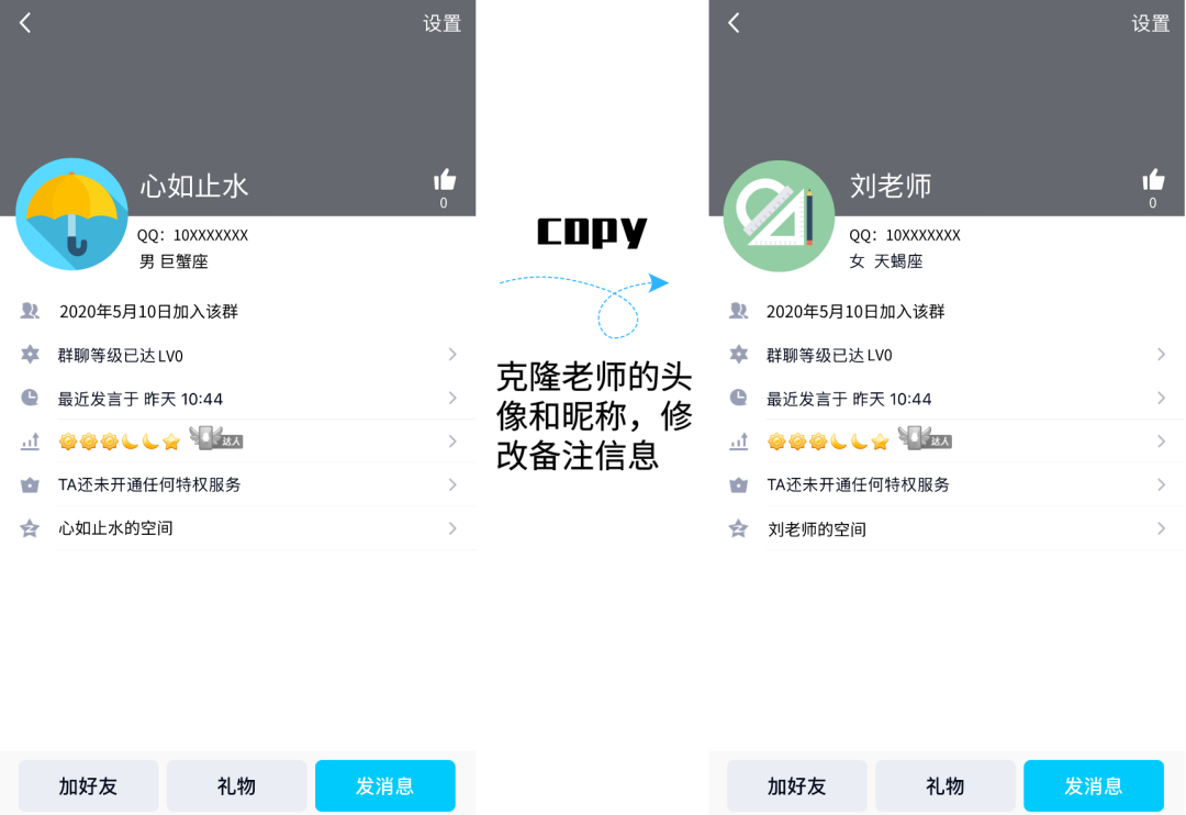 1、克隆老师的头像和昵称,修改备注信息。