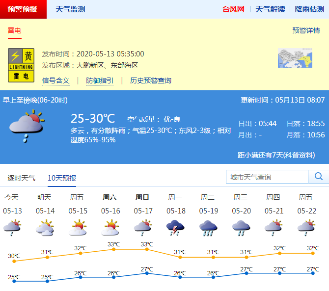 预计13日多云间阴天,气温24-29℃;14-17日多云到晴天,局部偶有短时阵雨或雷阵雨,最高气温可达32-33℃,天气渐趋闷热;展望18-19日有一次明显降雨过程。
