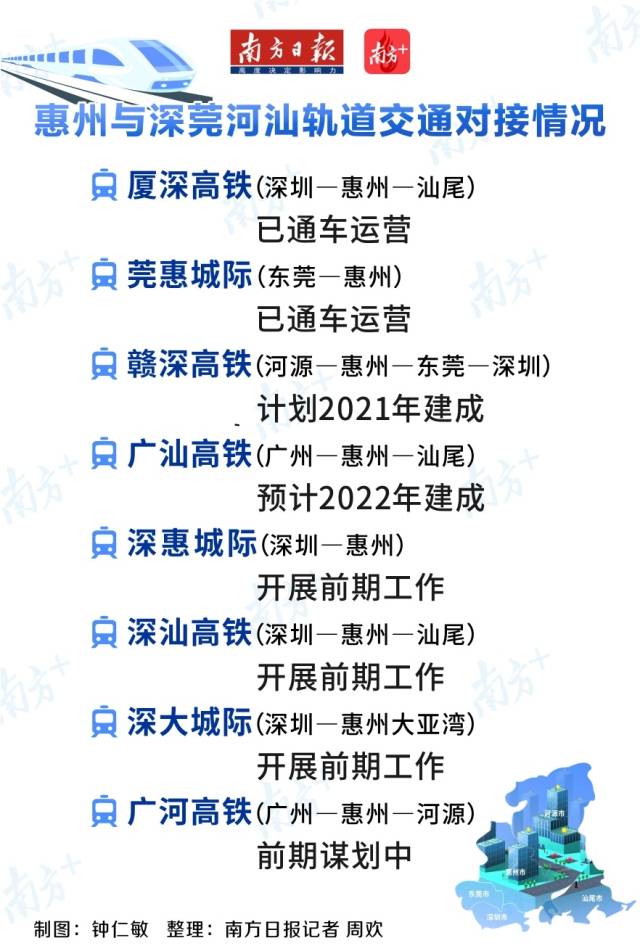 值得一提的是,待广汕高铁2022年建成后,从惠州到广州、汕尾也只要半小时。赣深高铁和广汕高铁还将在惠州实现转换衔接。加上正在开展前期工作的深惠城际、深汕高铁、深大城际等,轨道上深圳都市圈将初步成形。而惠州也将成为大湾区连接粤东、粤北以及闽赣地区的枢纽门户。