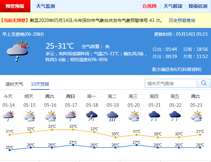 见圳客户端·深圳新闻网2020年5月14日讯 还记得前两天的强对流天气吗?目前仍是雷雨横行的季节,台风还需往后靠靠,台风未来两天不会影响深圳。据市气象台消息,14日深圳以多云天气为主,但仍有分散阵雨,大家外出记得带伞,遮阳又能遮雨。