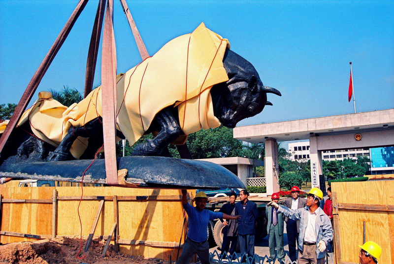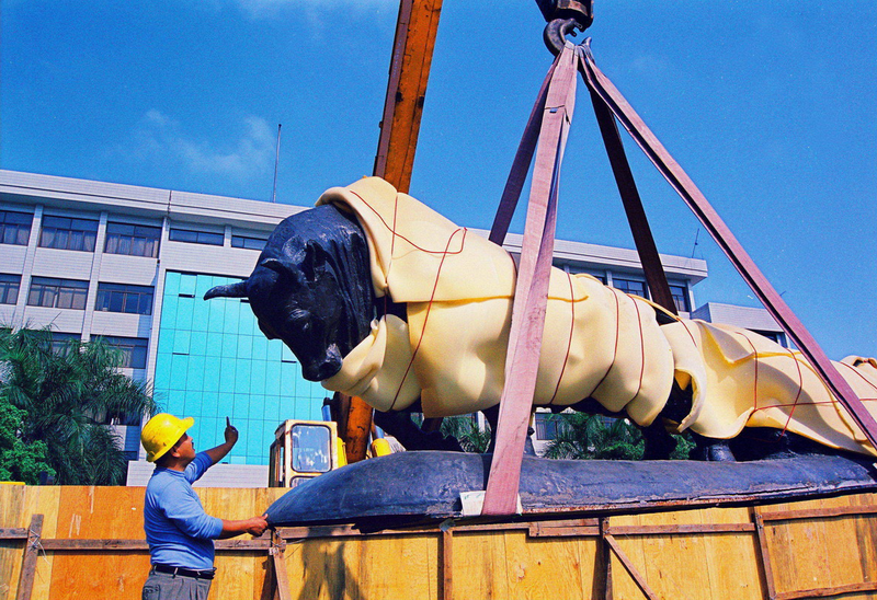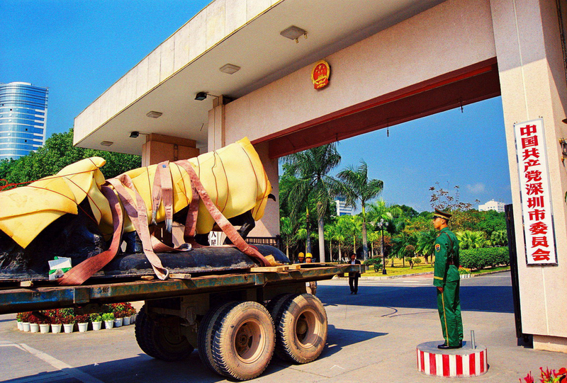 1999年2月6日,深圳“孺子牛”雕塑迁移到深圳市委大院门前。(组图)(摄影:韦建诚)