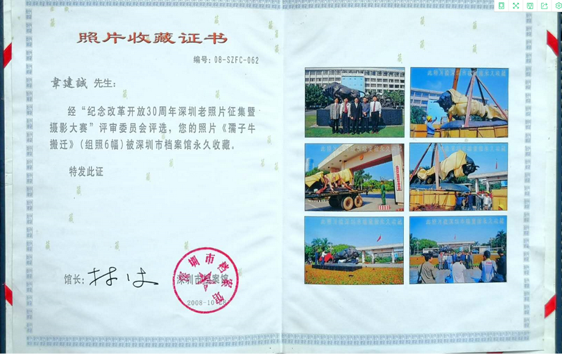 “一开始,我提出这个迁移建议时,还是有点忐忑的,后来得知‘孺子牛’雕塑将移至市委大院外后,我非常高兴,这样一来,跟‘孺子牛’合影就方便多了呀!”“孺子牛”雕塑迁移当天,韦建诚兴奋地拿起相机,用镜头定格下整个搬迁过程。“那一天是我人生最难忘的日子之一,既是我44岁生日,又是‘孺子牛’雕塑安新家之日。”回忆起当时的情况,韦建诚还是十分兴奋。而韦建诚拍摄的组照后来被深圳市档案馆永久收藏。深圳市委办公厅还将《市民希望将“孺子牛”雕塑移至市府大院外》评为一等奖。