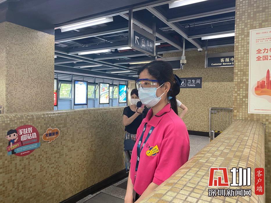 地铁站内,一位工作人员整齐佩戴口罩与护目镜,引导市民有序搭乘地铁。