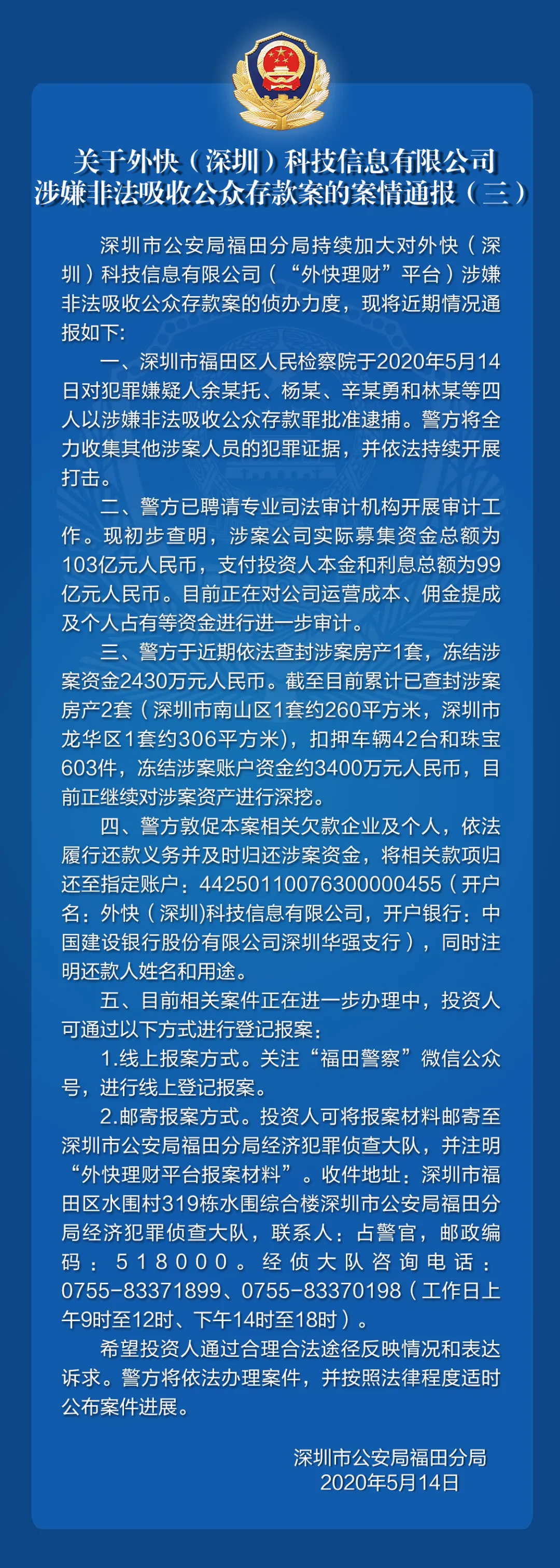 关于外快(深圳)科技信息有限公司涉嫌非法吸收公众存款案的案情通报(三)
