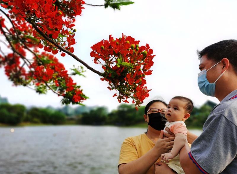 凤凰木又名火树、红花楹,由于其开花时"叶如飞凰之羽,花若丹凤之冠",因而得名「凤凰树」。每年5月至7月,是凤凰树开花的时节。在鹏城公园、道路两旁到处可见凤凰花盛开,当下凤凰花开正灿烂,锦簇花团红似火,成为鹏城亮丽的风景线。图为龙岗大运中心凤凰树花开吸引市观赏拍照。