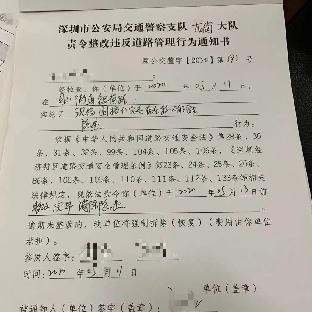 对该施工单位在横坪连接线路段占道施工导致人行道不连贯、机非冲突,存在较大交通安全隐患的行为,龙岗交警依法处罚10000元并责令立即整改。