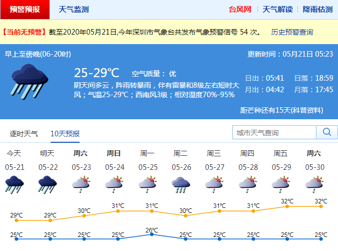 市气象局预计,21日凌晨到22日早晨深圳市有暴雨局部大暴雨,并伴有雷暴和8级左右短时大风,强降水主要影响时段在21日午后至22日早晨;22日白天降水减弱,23日转(雷)阵雨天气。