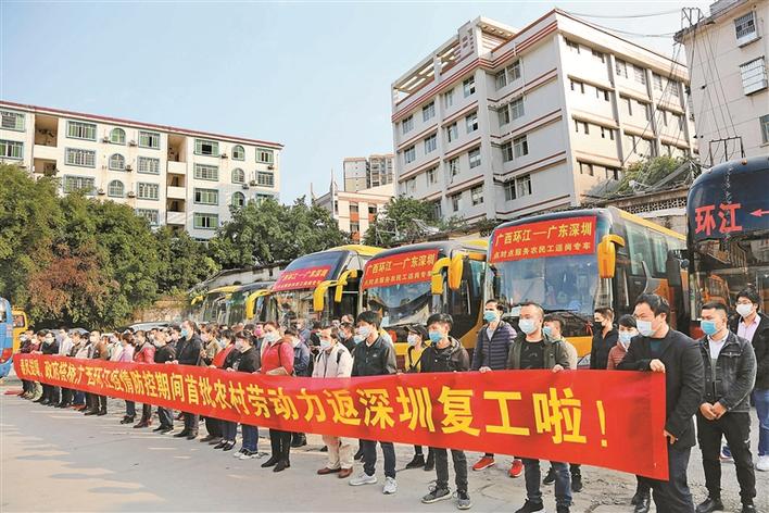 2月24日,福田区租赁6辆“爱心大巴”接收环江毛南族自治县农村劳动力统一前往深圳返岗复工。