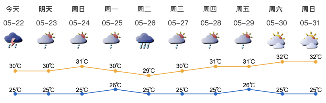 我市阴天,有雷阵雨;气温25-30℃;西南风3级,阵风6-7级;相对湿度75%-95%。
