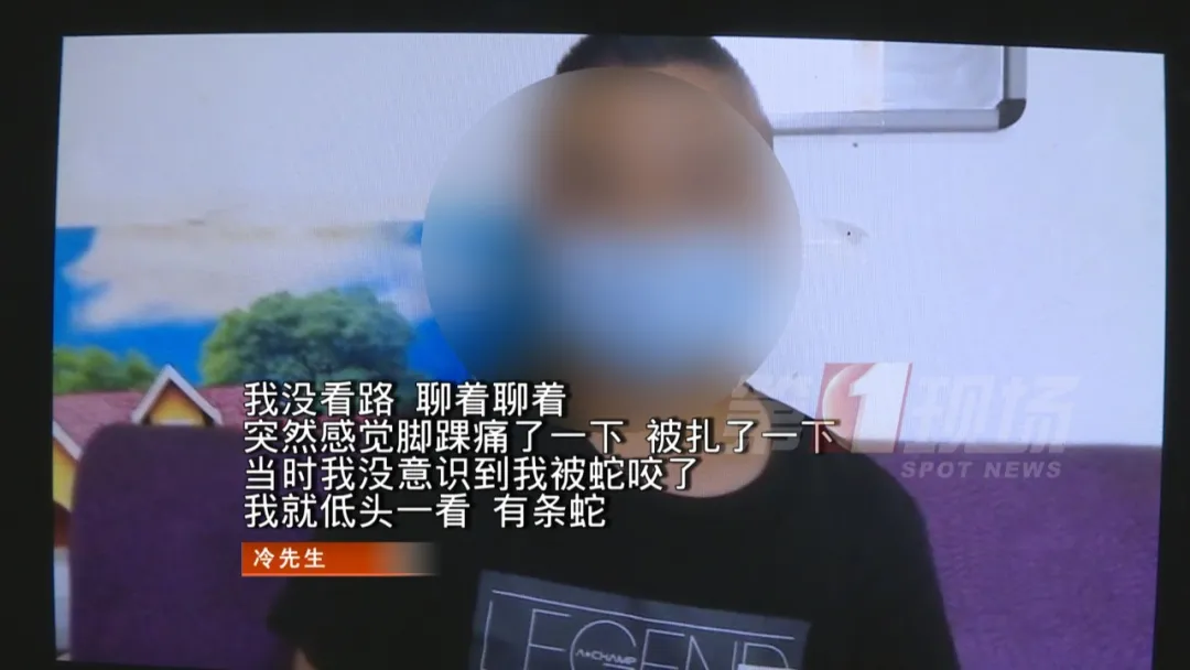 5月21日晚上7点多,市民冷先生和家人吃完晚饭后,独自来到位于坑梓的五马峰公园散步。他一边散步一边跟朋友视频聊天。刚走没多久,冷先生突然感觉自己的右脚有点不对劲,有被扎了一下的感觉。他低头一看,原来是被蛇咬伤了。