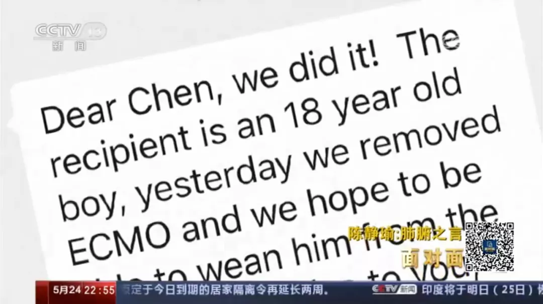 5月20日,全国人大代表、无锡市人民医院副院长陈静瑜收到了意大利同行发来的短信,意大利完成了欧洲首例新冠肺炎晚期肺纤维化的双肺移植,受者是一名18岁的男孩,中国经验在国际上得到分享传播。