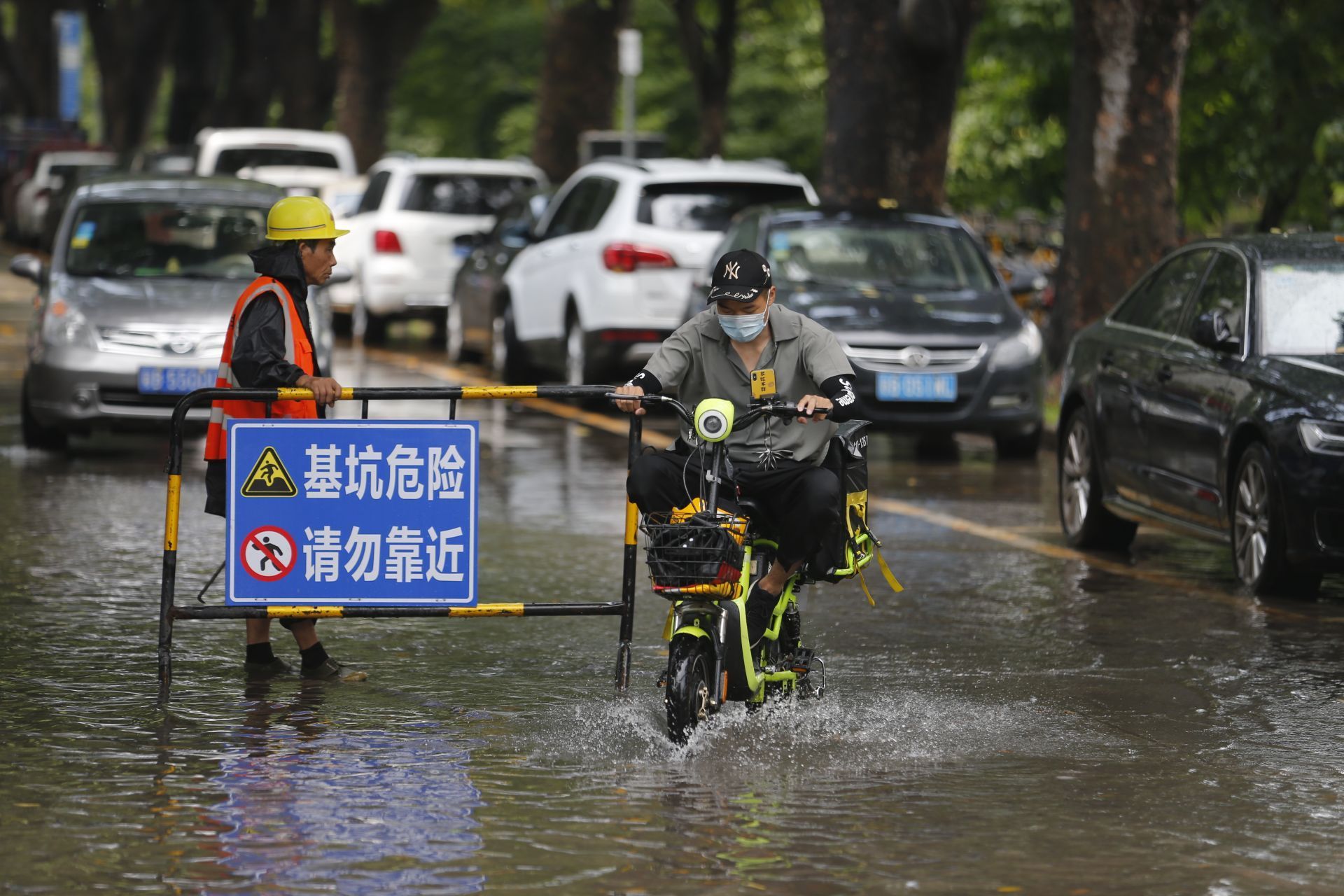2020年5月26日中午13:46分,商报东二路,短时强降水导致路面水浸,一位骑士经过水浸路面。