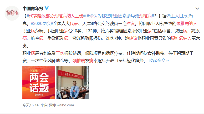 “代表建议部分颈椎病纳入工伤”