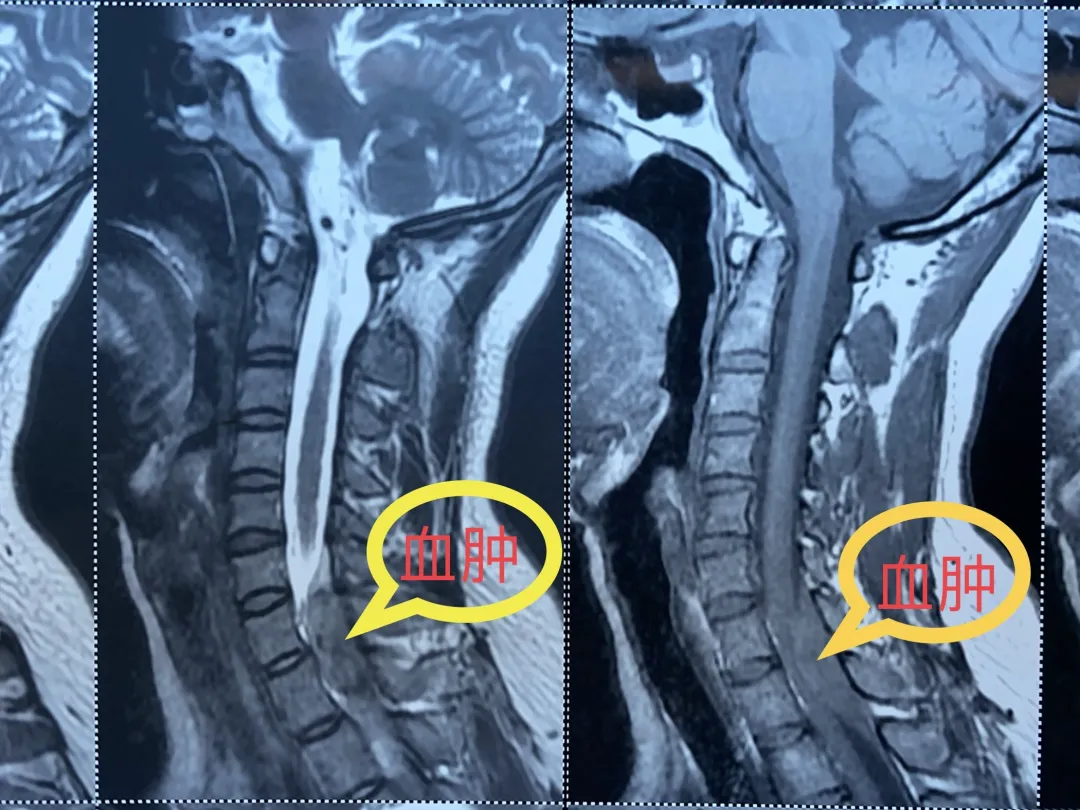 她在做颈部的活动过程中很可能导致了颈部椎管内的出血,按摩推拿的过程造成了颈部的活动幅度更加变大,里面的出血很可能在这个基础之上有所增加。从片子我们可以看到,由于血肿的压迫使脊髓变得非常薄,病人的截瘫就是由于脊髓受压导致的。