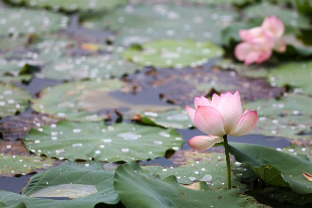 ▲雨后荷塘里荷花盛开 , 在一片碧绿中显得格外娇艳。