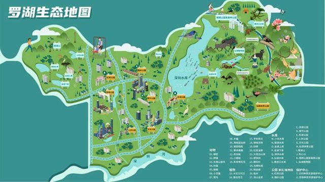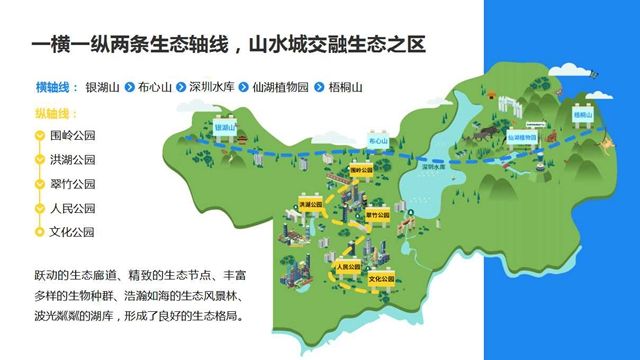 从横轴线看罗湖,有银湖山—布心山—深圳水库—仙湖植物园—梧桐山;从纵轴线看罗湖,有围岭公园—洪湖公园—翠竹公园—人民公园—文化公园。跃动的生态廊道、精致的生态节点、丰富多样的生物种群、浩瀚如海的生态风景林、波光粼粼的湖库,形成了良好的生态格局。